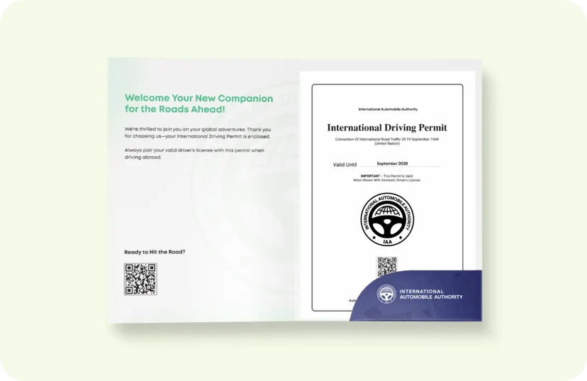 Our IDP booklet comes with an ID card, enhancing the functionality of your International Driving Permit. This card facilitates easier verification of your driving qualifications by international authorities.